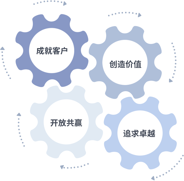 成就客户是一切决策的出发点,创造价值是衡量所有工作的标准,追求卓越是im电竞做事做人的态度,开放共赢是im电竞的格局也是最终的结果。价值观的齿轮环环相扣,推动着组织里的每个人不断向前。